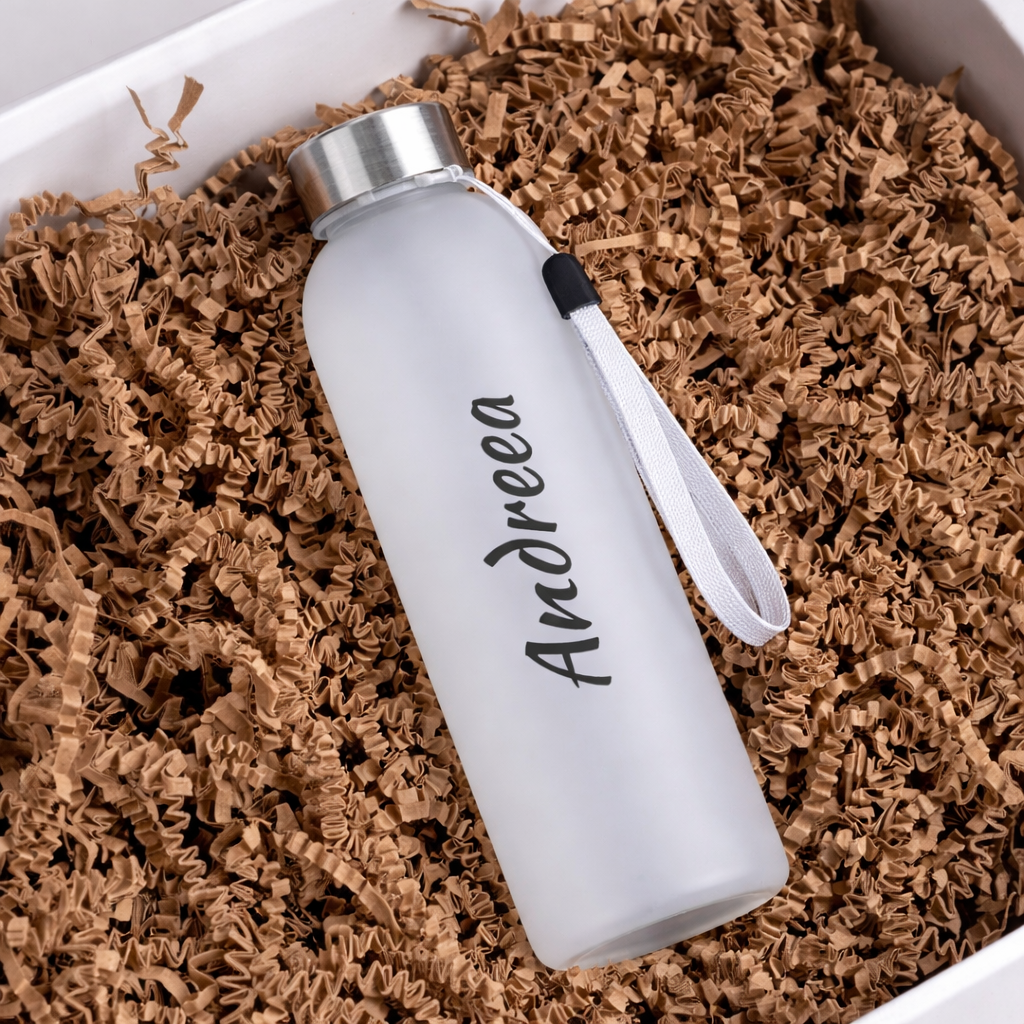 Realizată din sticlă cu finisaj frosted, cu un aspect modern și rafinat, sticla este completată de un capac din oțel inoxidabil fără BPA, sigur pentru consum și rezistent în timp. Șnurul de transport o face ușor de purtat oriunde – la birou, la sală, în mașină sau în călătorii. Fie că vrei să oferi un gest elegant sau un cadou cu valoare sentimentală, această sticlă personalizată este alegerea perfectă.