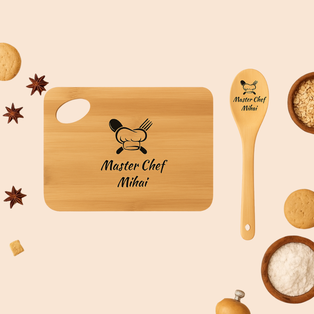 Set Cadou Personalizat – Șorț, Tocător și Lingură din Bambus