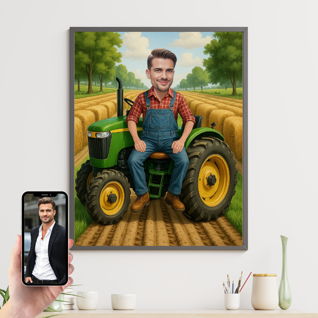 Acest tablou este creat special pentru a transforma munca și pasiunea pentru agricultură într-o amintire vizuală unică. Ilustrația îl prezintă pe fermier într-un stil cartoon modern, într-un decor specific fermei, cu câmpuri, utilaje și detalii care reflectă viața de zi cu zi.