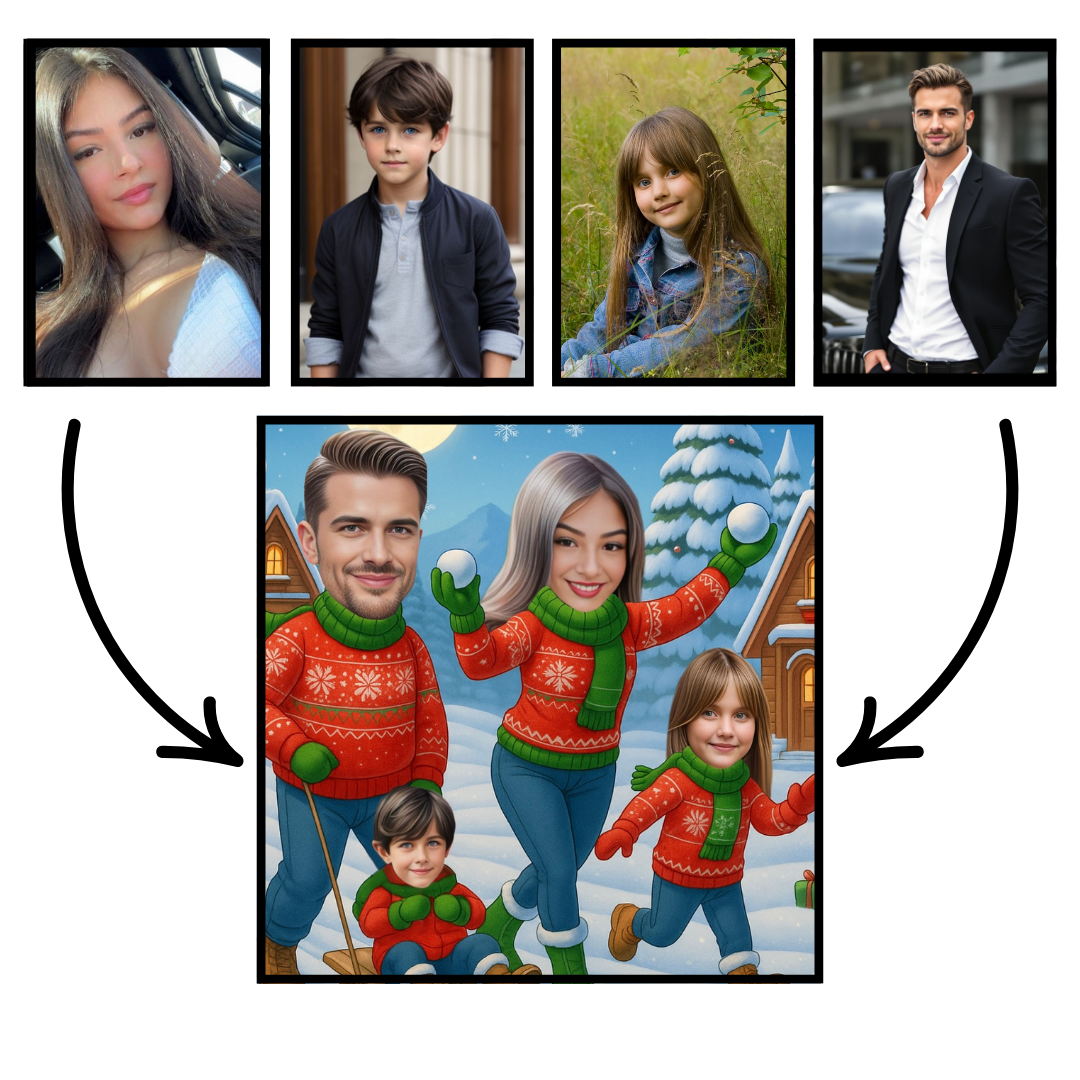 Tu ne trimiți fotografiile, iar noi le transformăm într-un tablou Cartoon personalizat de Crăciun, plin de bucurie, culoare și energie de iarnă. Personajele sunt ilustrate în ținută standard de sezon, iar fundalul prestabilit surprinde perfect atmosfera sărbătorilor: zăpadă, case luminate și joaca veselă în familie.