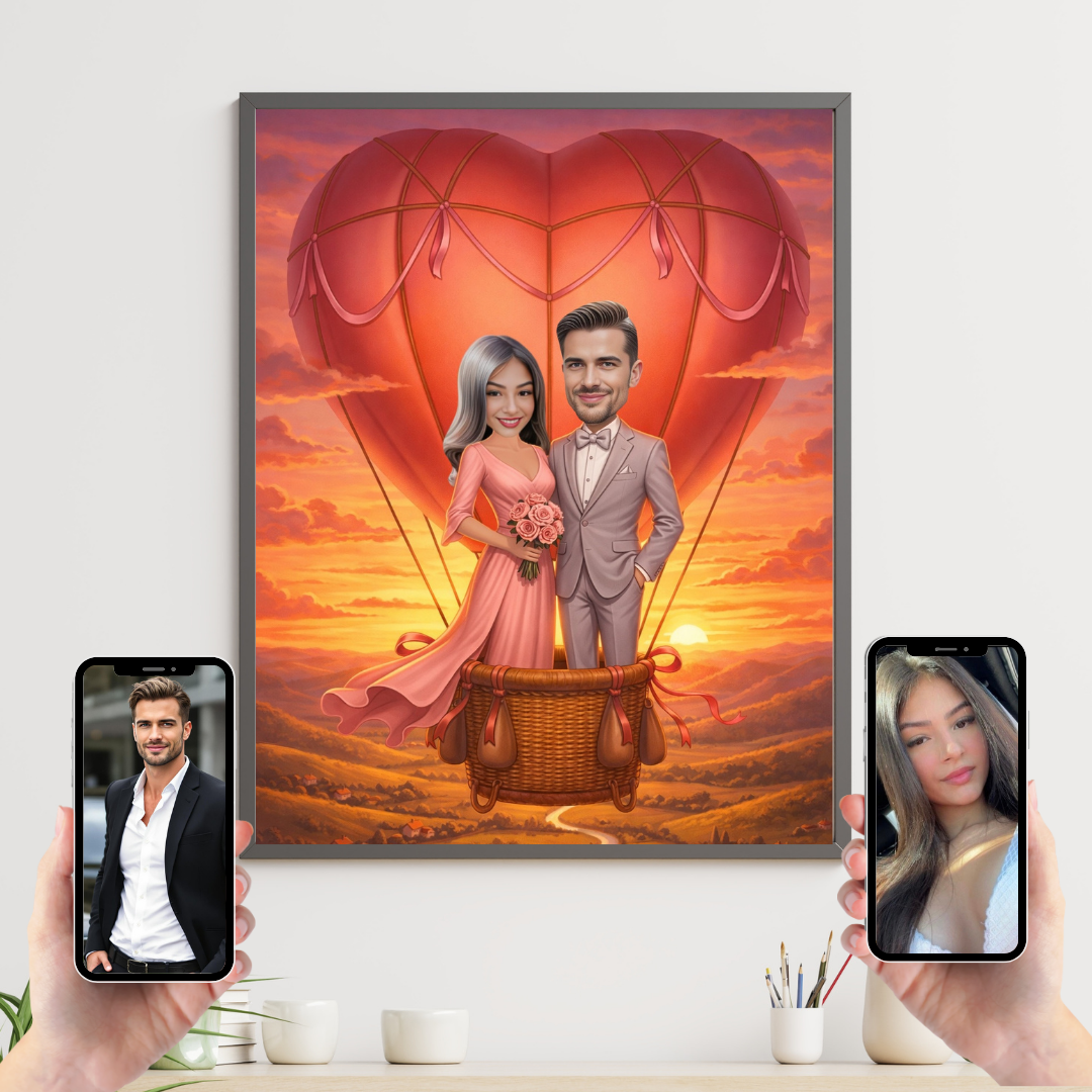 Când iubirea prinde aripi, fiecare vis devine posibil. Acest tablou cartoon personalizat surprinde un cuplu îndrăgostit într-o scenă romantică de poveste, plutind într-un balon cu aer cald în formă de inimă, deasupra unui peisaj spectaculos scăldat în culorile calde ale apusului. El, elegant și încrezător, ea, delicată și radiantă, ținând un buchet de flori, formează o imagine plină de armonie, romantism și emoție, care simbolizează începutul unei călătorii comune spre viitor.